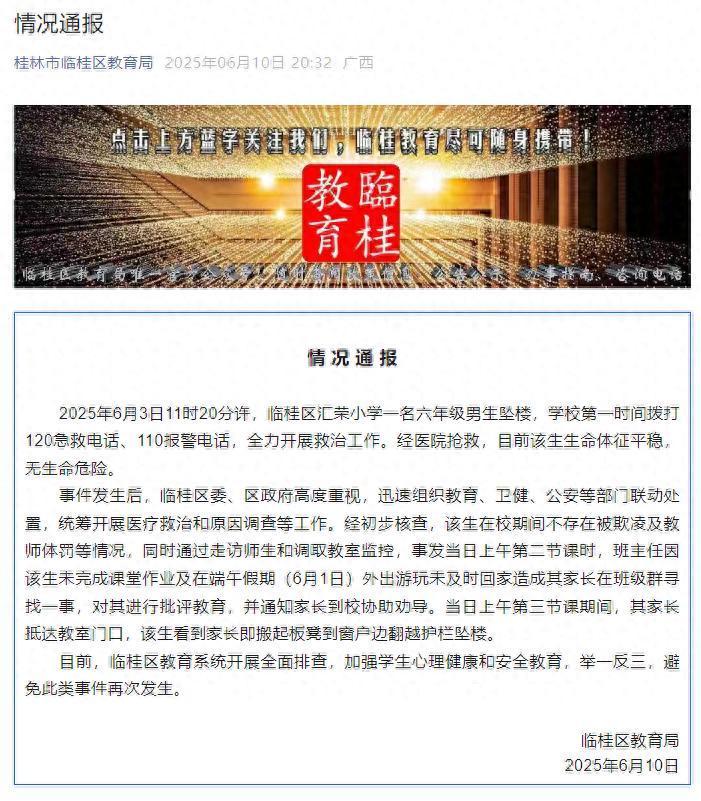 经初步核查,该生在校期间不存在被欺凌及教师体罚等情况,同时通过走访师生和调取教室监控,事发当日上午第二节课时,班主任因该生未完成课堂作业及在端午假期(6月1日)外出游玩未及时回家造成其家长在班级群寻找一事豪门国际登陆,对其进行批评教育豪门国际登陆,并通知家长到校协助劝导。事件发生后豪门国际登陆,临桂区委、区政府高度重视,迅速组织教育、卫健、公安等部门联动处置,统筹开展医疗救治和原因调查等工作。目前,临桂区教育系统开展全面排查,加强学生心理健康和安全教育,举一反三,避免此类事件再次发生。根据通报显示,该生在校期间不存在被欺凌及教师体罚等情况。经医院抢救,目前该生生命体征平稳,无生命危险。具体信息如下:广西桂林市临桂区教育局6月10日通报,6月3日11时20分许,临桂区汇荣小学一名六年级男生坠楼,学校第一时间拨打120急救电话、110报警电话,全力开展救治工作。当日上午第三节课期间,其家长抵达教室门口,该生看到家长即搬起板凳到窗户边翻越护栏坠楼。