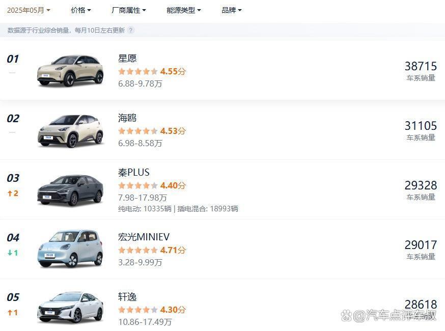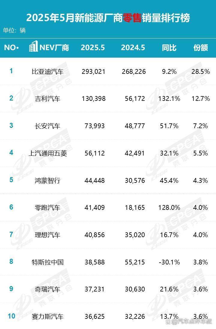 举报/反馈与此同时,乘联分会也公布了5月份的国内车企销量榜单,其中,比亚迪以29.3万辆稳居榜首,同比增长9.2%,市场份额也位列第一,达到了15.1%,作为新能源汽车市场的领军者,其拥有比亚迪、腾势、方程豹、仰望四大品牌,比亚迪品牌主攻平民市场,腾势冲击高端市场,方程豹以硬派越野切入细分赛道,仰望则以U8、U9等车型挑战百万级市场。实现了全价位覆盖。而且今年以来,比亚迪还上市了多款重磅新车,包括秦L EV、汉L、唐L、方程豹钛3、仰望U7,助力比亚迪抢夺了更多市场份额,随着更多重磅新品的上市,或将进一步夯实其在新能源市场的统治力。