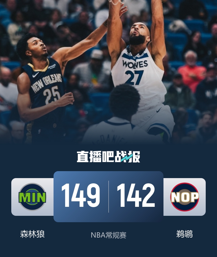 此役一上来两队短暂试探,戈贝尔内线攻防一体,爱德华兹连投带罚续上火力,费尔斯连续取分短暂回应,首节结束时森林狼领先6分,次节回来,墨菲突然发力单节独得11分,末段森林狼进攻断电,鹈鹕一波13-3后来居上,半场战罢,鹈鹕反超10分。短暂休整后两队拉开对攻,爱德华兹单节狂揽19分率队蚕食分差,三节结束后森林狼追至只差3分,末节上来,两队鏖战至最后时刻,爱德华兹关键上篮绝平,奎因绝杀未果后进入加时,兰德尔连续单打得手豪门国际注册,森林狼一波8-0确立胜势,最终森林狼149-142击败对手迎来三连胜,同时送给鹈鹕4连败。